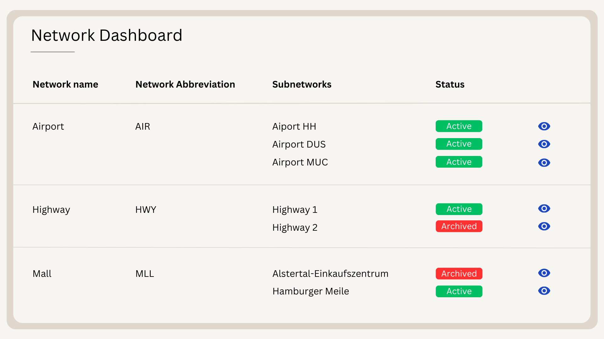 The Network Dashboard provides you with an overview of all networks, including their respective statuses. Have a one-stop glance whether a particular network and its subnetworks are active, in maintenance, set-up or disabled. If desired, the individual networks can be scrutinized and edited here.
