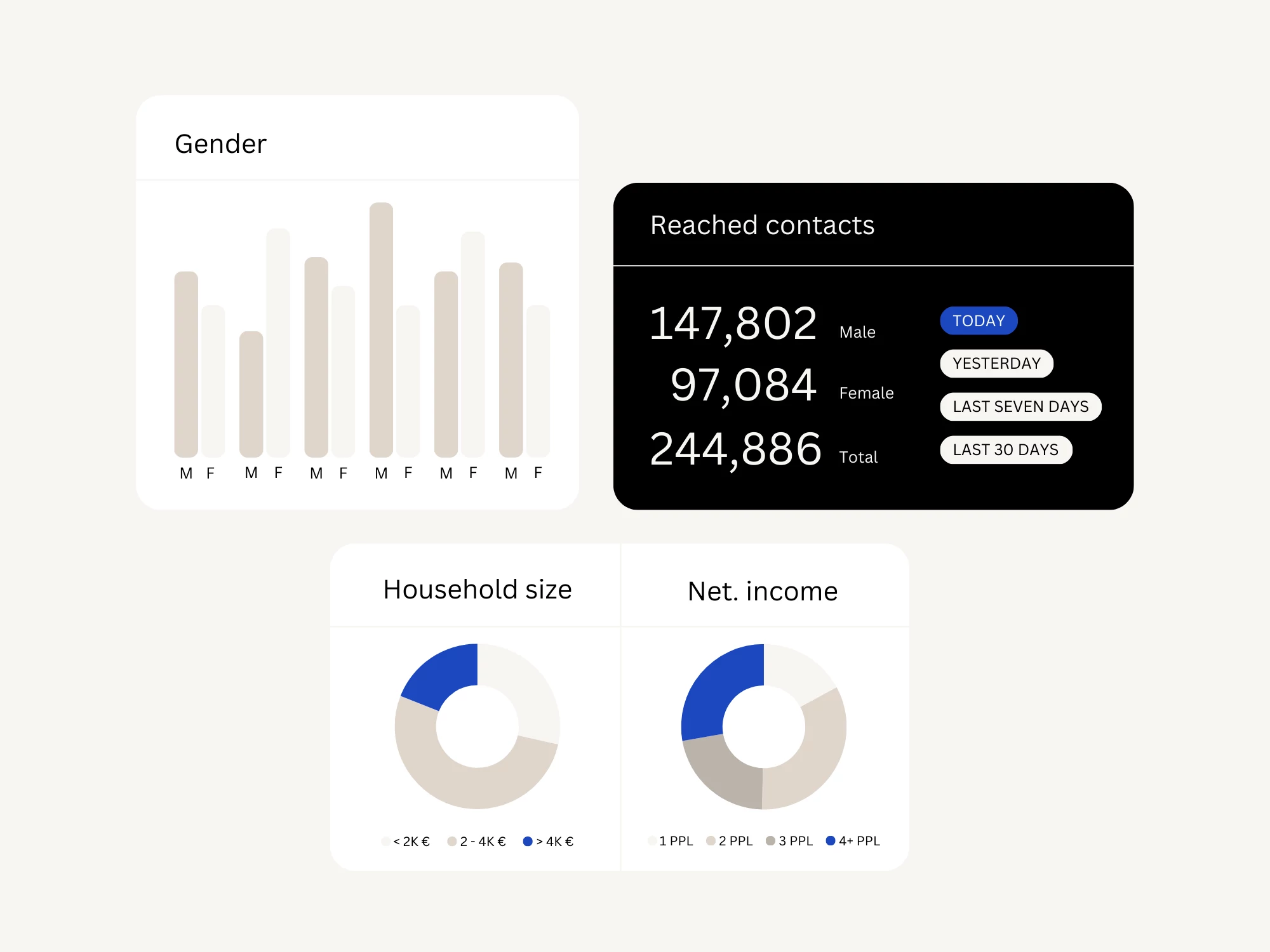 Assess and improve the effectiveness of advertising by analyzing frequencies in terms of viewability, brand safety, audience metrics and more. DMP1 easily connects numerous demographic data such as gender, age distribution or net household income with your first-party-data and delivers essential insights about your audience.