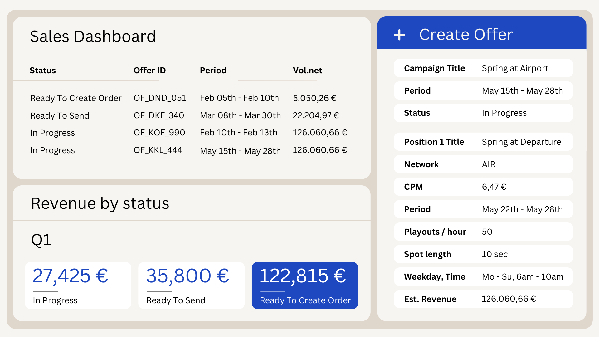 The Sales Dashboard provides a comprehensive overview of all previously created offers and their current status. Get an immediate overview of which offers are currently in progress or can already be sent. Gain a better understanding of potential revenue streams by categorizing forecast revenue in status, client and network. If desired, the individual offers can be selected, viewed, and edited directly from the dashboard.