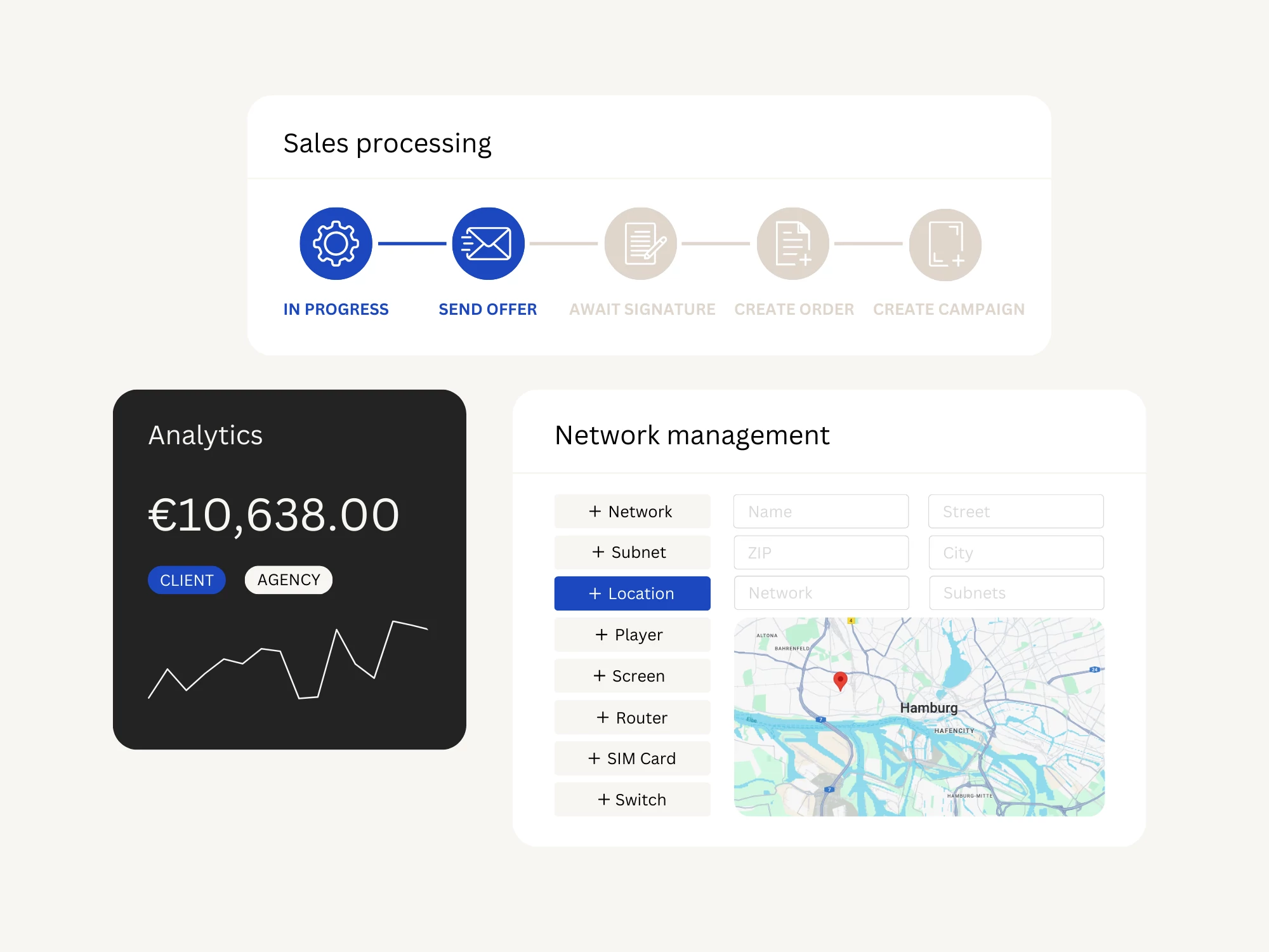 NMS1 is a sales and network management system designed specifically for the needs of DOOH publishers. Benefit from a structured offer tool and improve your sales activities, or manage your inventory from one central point of control to get detailed insights into your entire network.